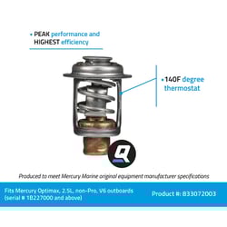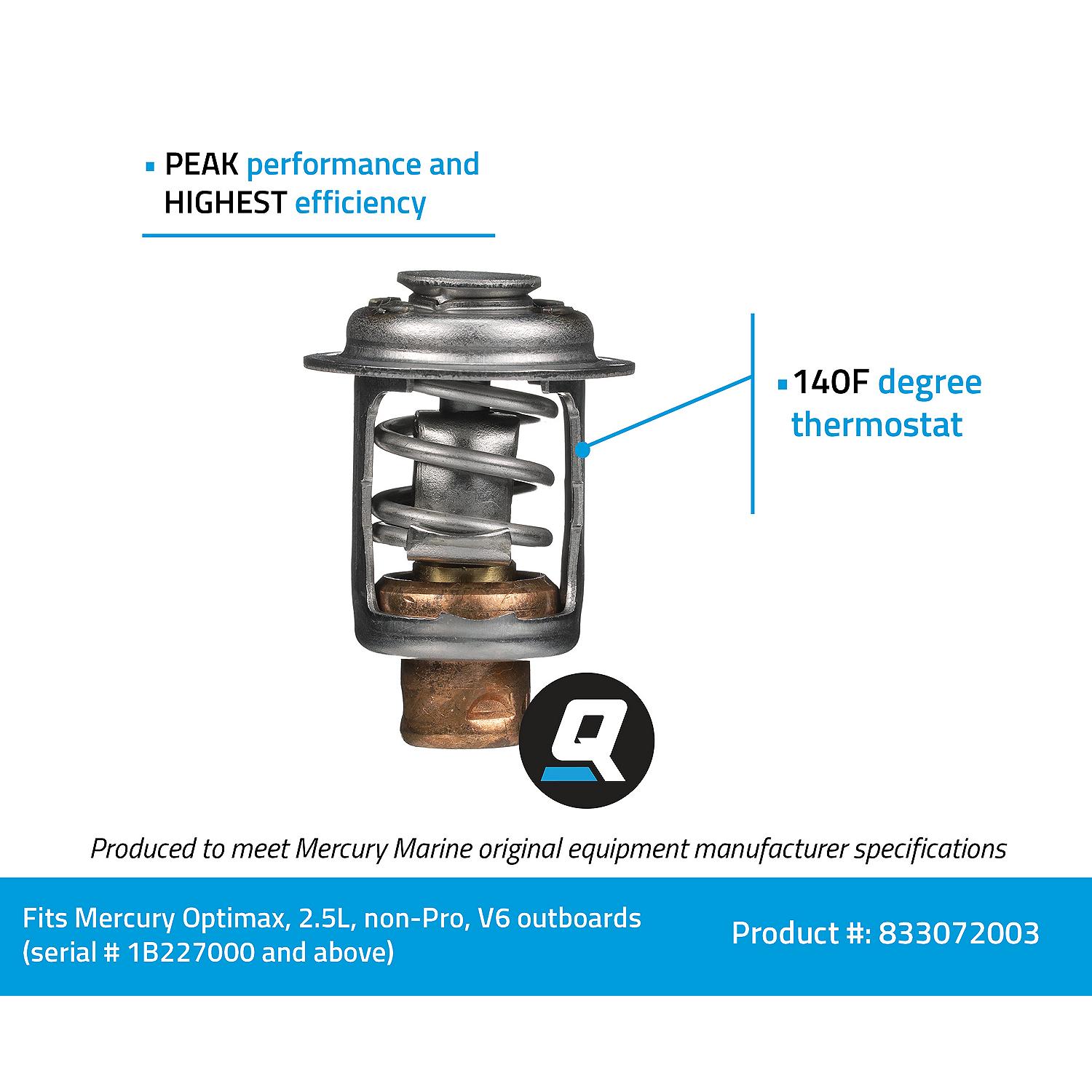 The Quicksilver 833072003 is a precision-engineered replacement thermostat designed specifically for 75-115hp Mercury OptiMax outboard engines with serial numbers 1B227000 and above. This OEM thermostat maintains optimal engine operating temperature at 143°F, ensuring your outboard runs at peak performance and efficiency.