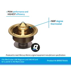 The Quicksilver 8M0076464 is a precision-engineered 160°F replacement thermostat designed specifically for MerCruiser sterndrive and inboard engines. This OEM thermostat is compatible with the MerCruiser 496 Magnum, 496 HO sterndrive models, as well as 8.1L and 8.1L HO MerCruiser inboard engines.