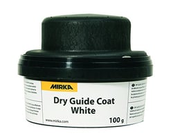 The Mirka Dry Guide Coat is a professional-grade white powder designed to reveal surface imperfections and scratches during the sanding and refinishing process. This 100-gram applicator is specifically formulated for use on dark-colored surfaces, where the white powder provides maximum contrast to highlight even the smallest defects before final finishing.