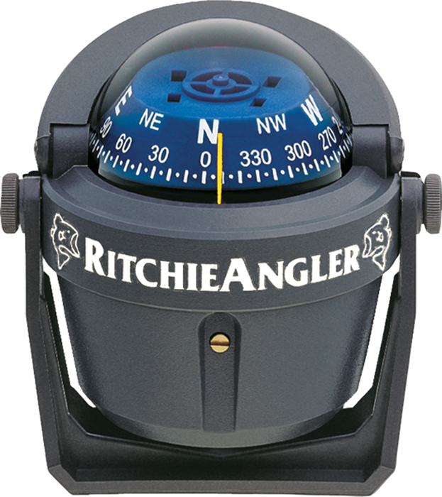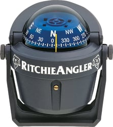 The Ritchie Navigation RA-91 Angler Compass is a bracket-mount marine compass designed for small boats and fishing applications. This 100% repairable compass features a 2-3/4 inch (70mm) direct-reading dial with a no-glare gray finish and high-visibility blue dial with distinctive RitchieAngler graphics.