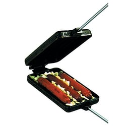 To use, simply open the clam shell casting, place your hot dogs or brats inside the three cavities, close and latch securely, then cook over your campfire, fire pit, or grill until done. The cast iron construction provides excellent heat distribution and prevents the charring that comes from direct flame exposure. Perfect for family camping trips, backyard fire pits, and outdoor gatherings. An original design by Rome Industries, specialists in campfire cooking since 1964.