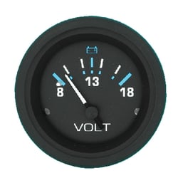 The Sierra 68408P Eclipse 12V Voltmeter provides accurate voltage monitoring for marine electrical systems, measuring 8-18 volts. This premium marine gauge features smart white and blue graphics on a black dial background, combining excellent readability with modern aesthetics.