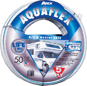 The Teknor Apex Aquaflex drinking water hose is specifically designed for safe, reliable connections between RVs, boats, and marine vessels to community water supplies. This NSF-certified hose ensures clean, fresh-tasting water for potable applications.