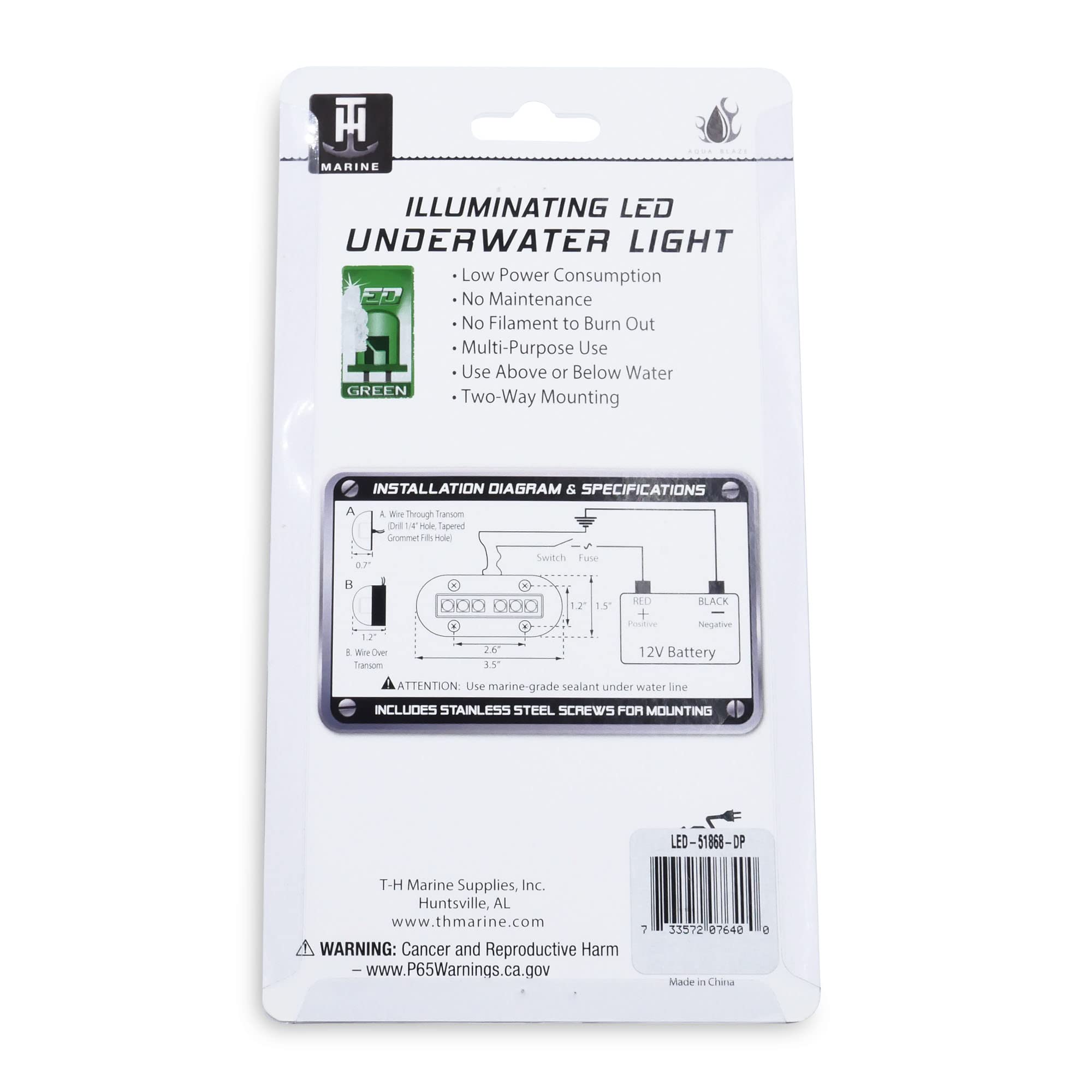 The T-H Marine LED51868DP is an affordable high-intensity LED underwater light designed for versatile marine applications. This waterproof light unit features 6 green LEDs and can be mounted above or below the waterline, making it ideal for fishing, diving, or adding ambient lighting to your boat.