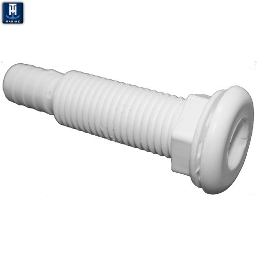 The T-H Marine TH752B is a durable 3/4-inch straight thru-hull bulkhead fitting designed for marine applications. This white polypropylene fitting provides a reliable connection point for hoses passing through boat hulls, bulkheads, or other marine surfaces.
