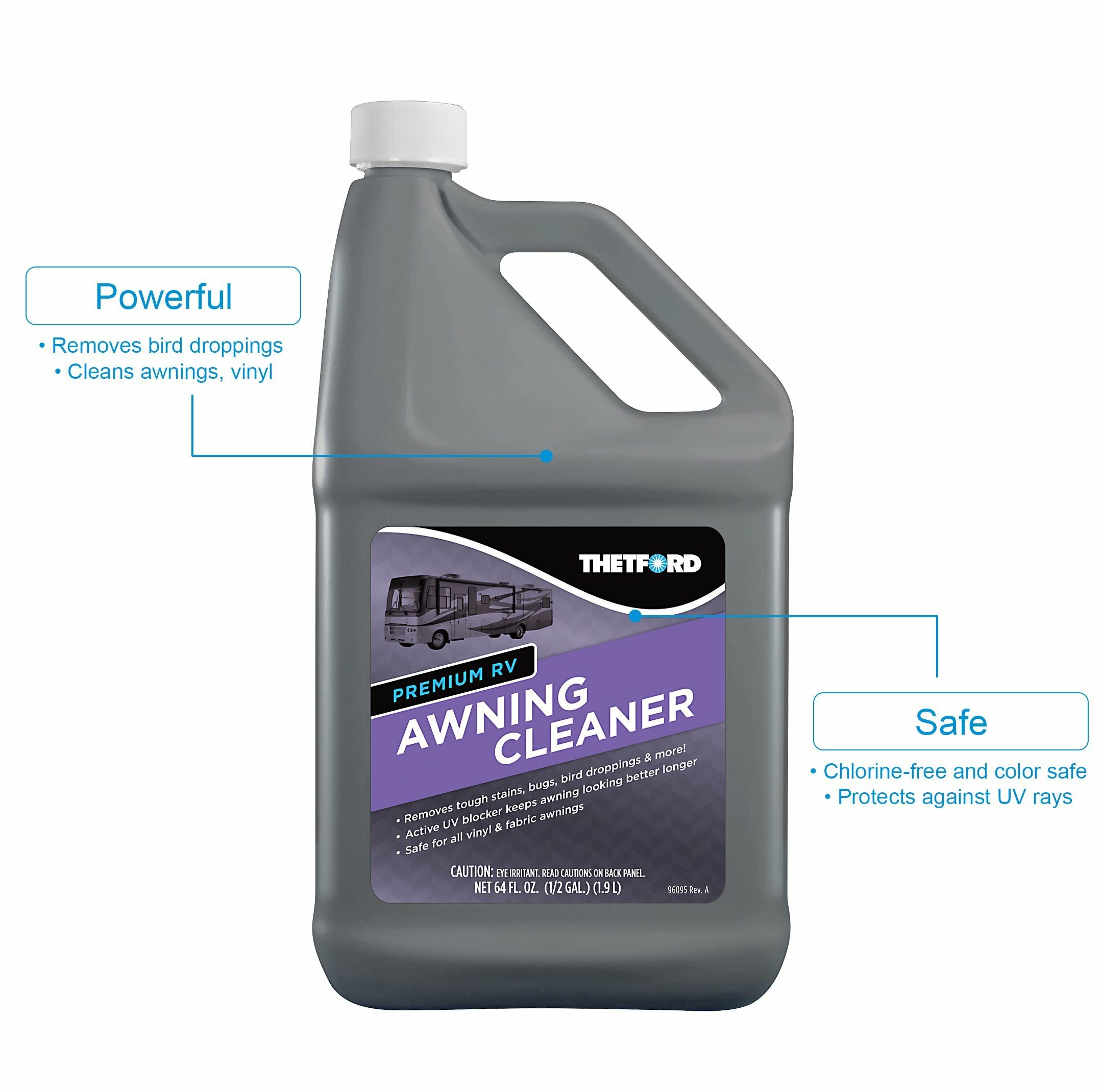 Thetford 96017 Awning Cleaner is a powerful yet gentle cleaning solution designed specifically for RV and outdoor awnings. This 64-ounce formula effectively removes tough stains including mold, mildew, leaf stains, tree sap, bird droppings, and insects from both fabric and vinyl awning surfaces.
