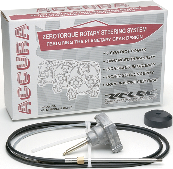 The Uflex ACCURA13FC is a complete 13-foot nonreversible steering system designed for boats with moderate rudder torque. This premium steering package features patented ZeroTorque Feedback clutch technology coupled with a planetary gear helm that eliminates rudder torque at the steering wheel, providing smooth and effortless boat control.