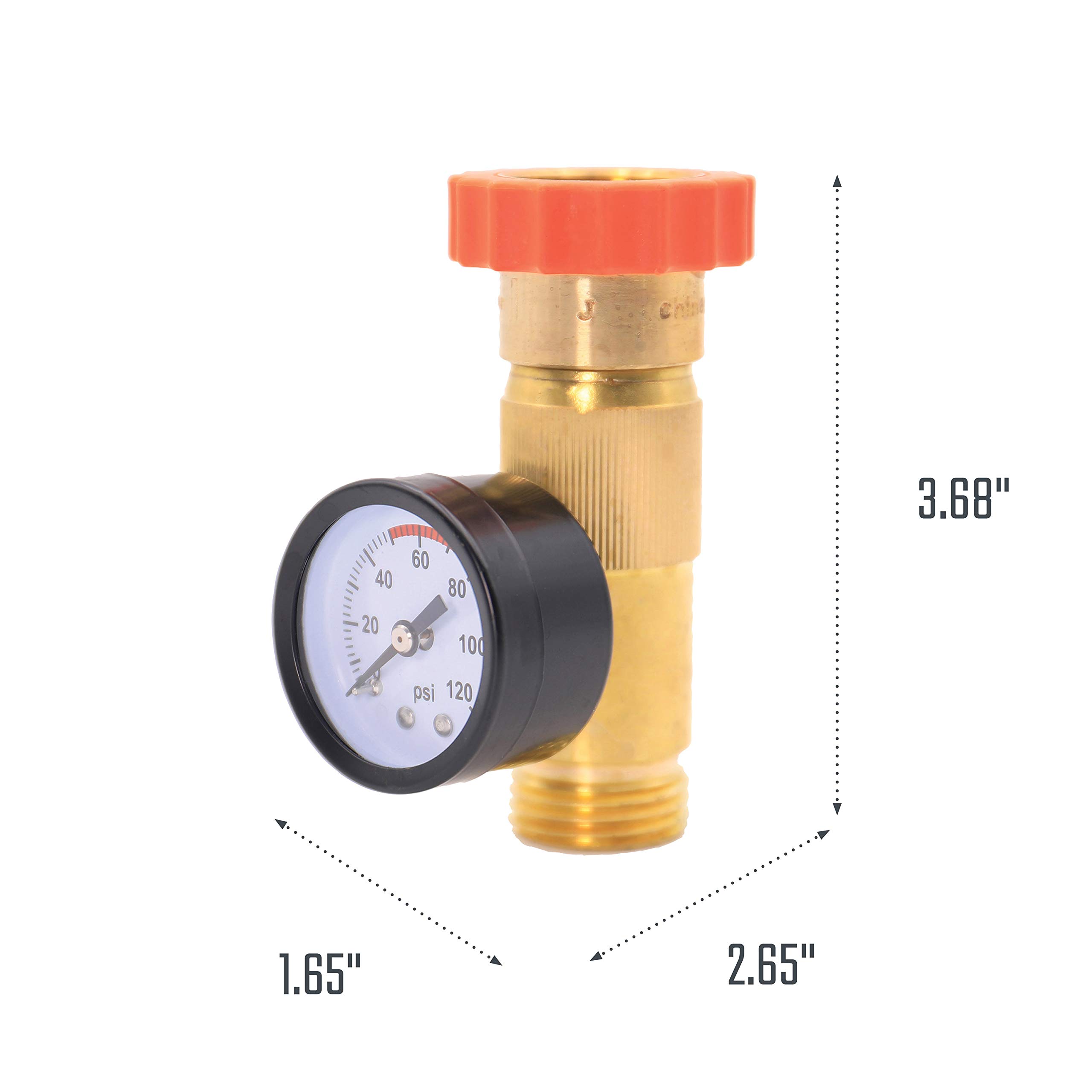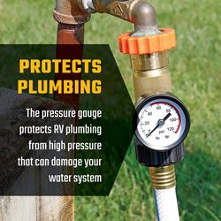 This water regulator is an essential accessory for any RV owner, providing peace of mind when connecting to unknown water sources. The integrated gauge allows you to monitor incoming pressure at a glance, while the regulator automatically adjusts flow to protect your investment. Compatible with all standard RV water systems and garden hose connections.