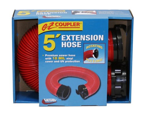 The Valterra D04-0112 EZ Coupler extension hose provides an additional 5 feet of length to your RV sewer hose system, making it easier to reach distant dump stations. This durable extension hose features factory-installed bayonet fittings with a rotating collar design that allows the hose to lay flat even after twisting the fittings into place, preventing kinks and tangles.