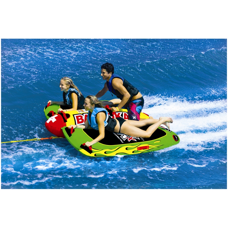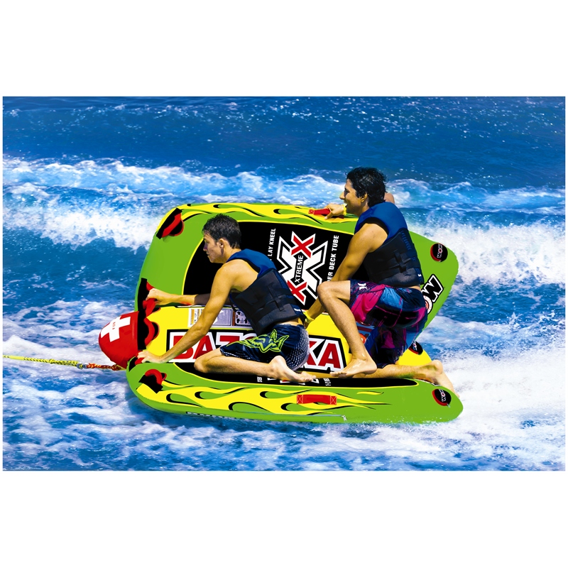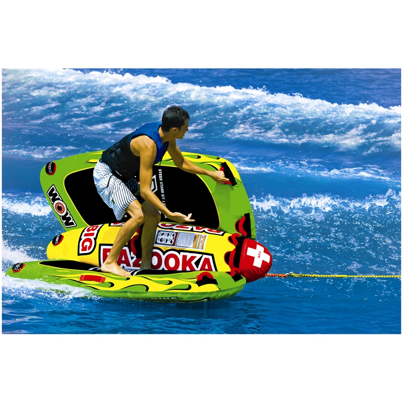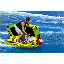 The WOW Watersports Big Bazooka is a completely new style deck tube that allows you to do much more than the traditional deck tube. This versatile towable holds up to 4 riders and can be used in 1, 2, 3, and 4 person configurations, making it the perfect addition to your boating adventures.