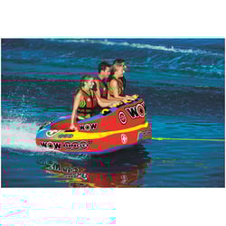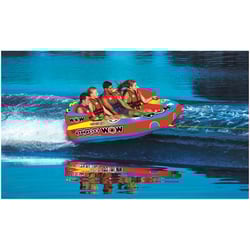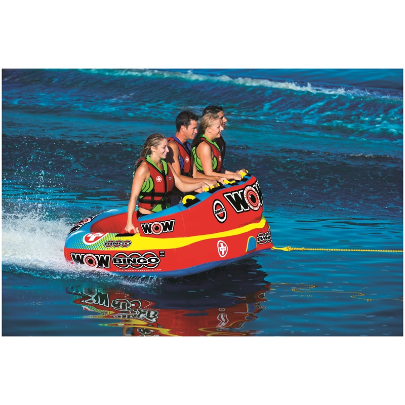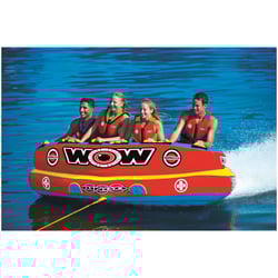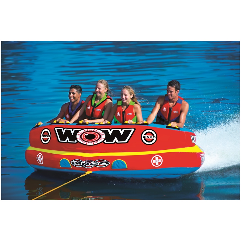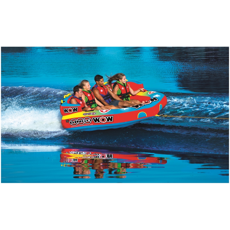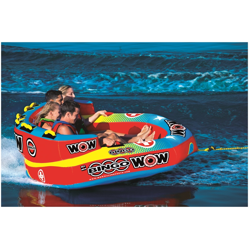 The WOW Sports Bingo 4 is a versatile 4-person inflatable towable tube designed for thrilling watersports adventures. This premium towable features reinforced front and back tow points, allowing you to configure it as a 2-in-1 towable for different riding experiences on the water.