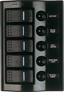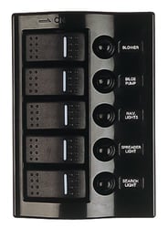 This switch panel simplifies electrical management by combining switching and circuit protection in one space-saving unit. The illuminated switches and back-lit labels provide excellent visibility in low-light conditions, while the resettable breakers eliminate the need for fuse replacement. Ideal for controlling navigation lights, bilge pumps, aerators, electronics, and other 12-volt accessories on boats, RVs, and marine applications.